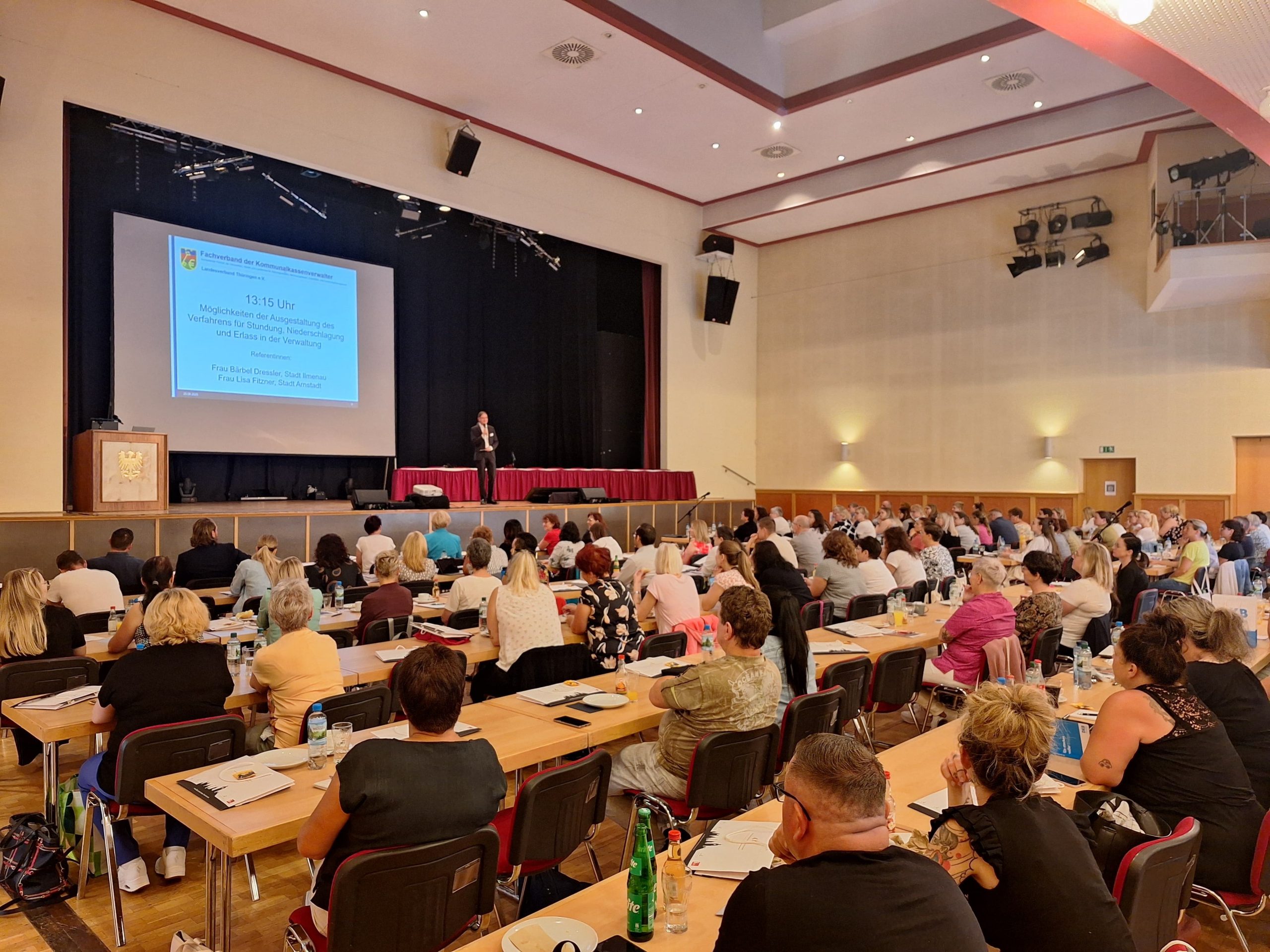 Am 25.06.2025 führte der Fachverband der Kommunalkassenverwalter Landesverband Thüringen e. V. seine Landesarbeitstagung durch. Insgesamt 114 angemeldete Teilnehmer aus 57 Mitgliedskommunen folgten der Einladung nach Arnstadt, außerdem die Bundesgeschäftsführerin des Fachverbandes, Andrea Sommerfeldt, sowie als Vertreterin des Landesverbandes Sachsen-Anhalt die Landesvorsitzende, Evelyn Eisenhuth.