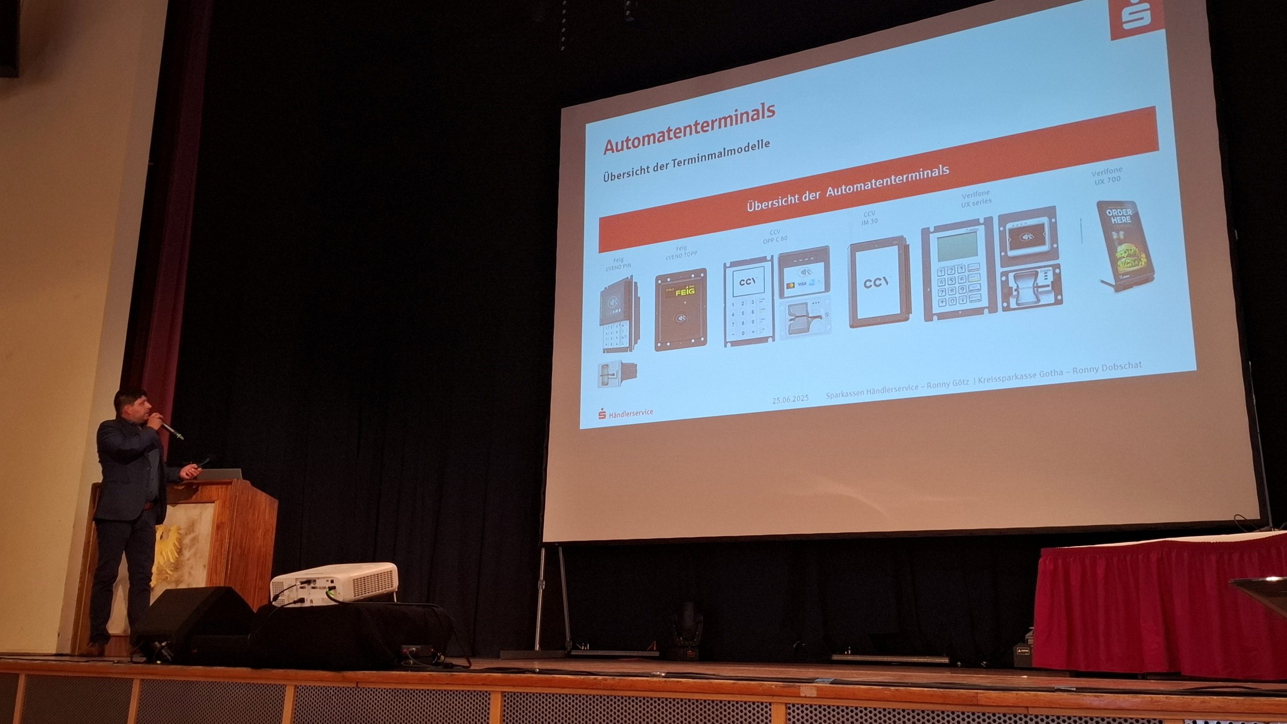 In einem ersten Fachvortrag thematisierten Ronny Dobschat von der Kreissparkasse Gotha und Ronny Götz von der PAYONE GmbH „Mobiles, bargeldloses Bezahlen in der Praxis“ und vermittelten einen Überblick über die gegenwärtigen technischen Möglichkeiten.